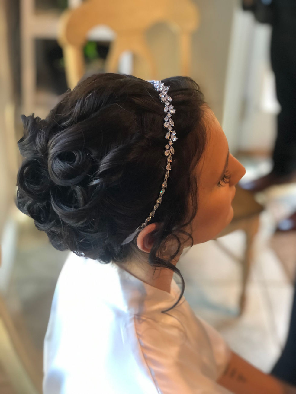 A collection of images showcasing various bridal hair styling options, including Up dos. These images feature different hair accessories and hair treatments, perfect for brides looking for their dream wedding hairstyle.